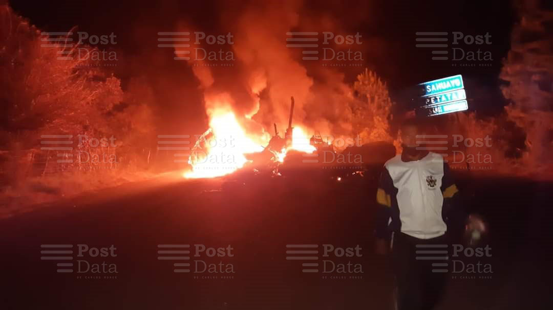 Tangamandapio, Mich.- Un grupo de habitantes de la comunidad indígena de Tarecuato, mantienen un bloqueo carretero sobre en las inmediaciones de su población en protesta por el múltiple homicidio de 11 personas, en medio de la manifestación esta noche incendiaron un camión de pasajeros que mantenían retenido, lo que se suma a una camioneta quemada hace unas horas.