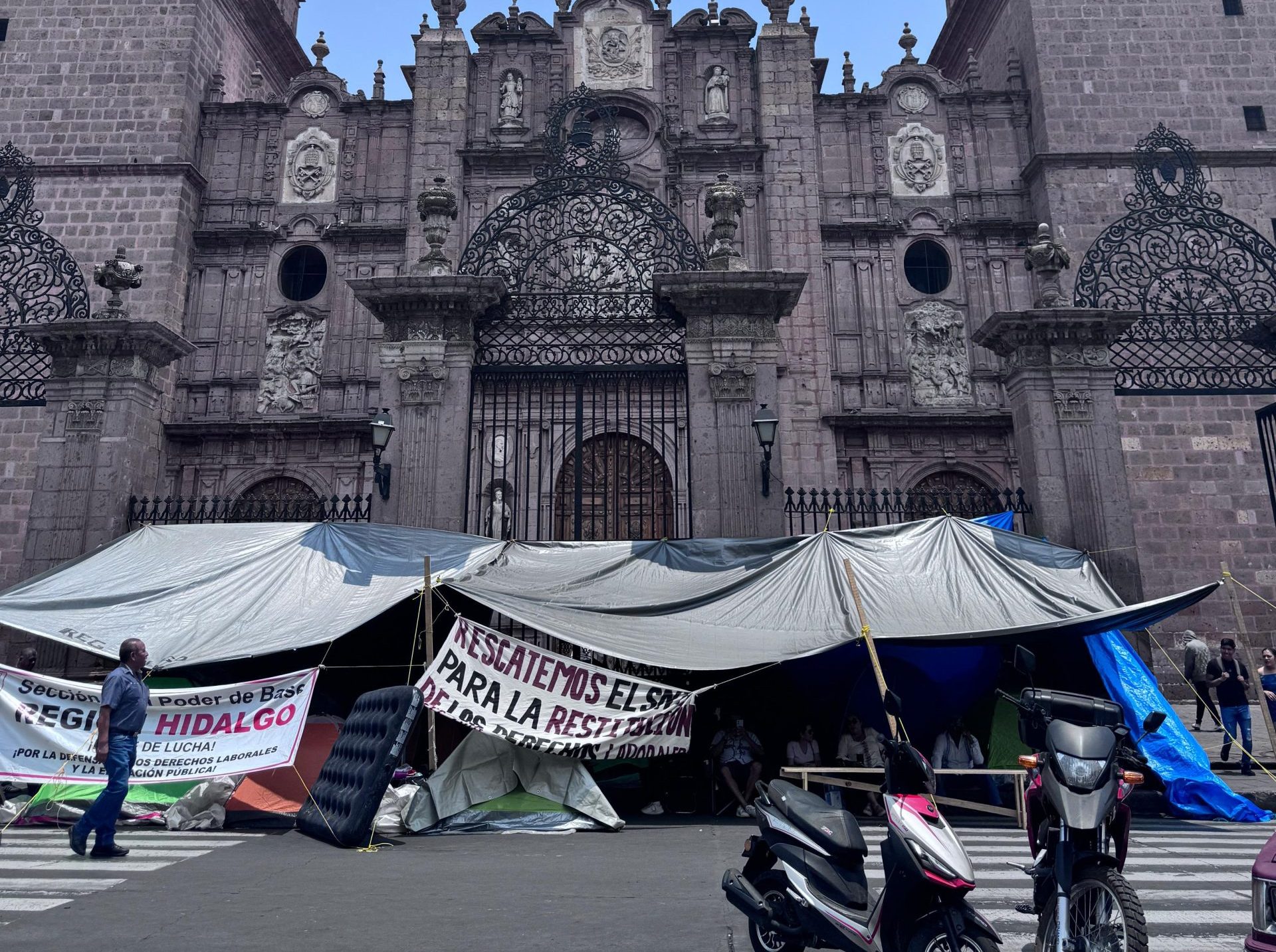 El plantón de los trabajadores de la educación, de la fracción Poder de Base de la Sección XVIII, cumplió un día instalado en un tramo de la avenida Madero desde la calle Abasolo a Morelos Norte.