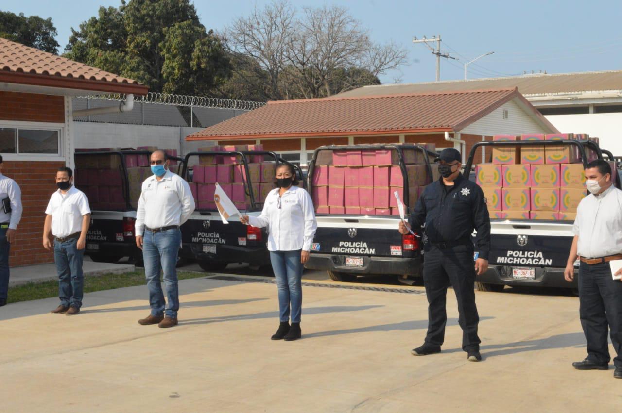 Los apoyos de Michoacán Alimenta, se están entregando con el apoyo de la Policía Michoacán, casa por casa, manteniendo y reforzando las medidas de seguridad sanitaria, por lo que se exhorta a la población a permanecer en sus viviendas, con el único fin de disminuir riesgos de contagios.