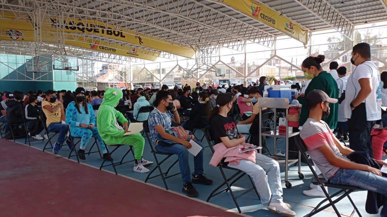 Así se desarrolla la jornada de vacunación contra el Covid-19 para adolescentes de 15 a 17 años de edad en la Unidad Deportiva “Ejército de la Revolución” en la capital michoacana, donde este miércoles y jueves se aplicará la segunda dosis.