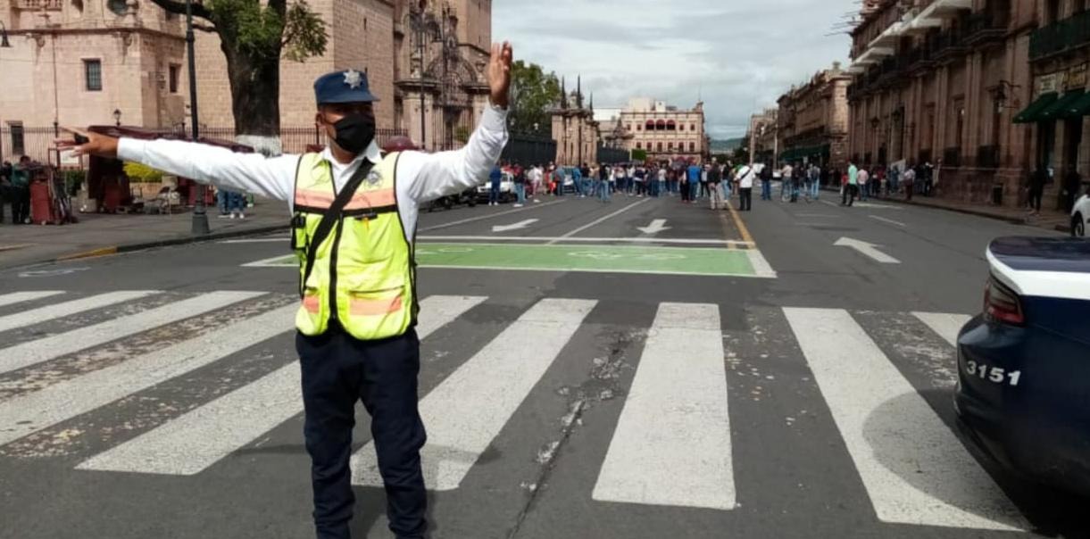 El principal cuadro del centro histórico de Morelia se encuentra cerrado por la manifestación de integrantes de la Sección XVIII de la Coordinadora Nacional de Trabajadores de la Educación (CNTE), de la fracción Poder de Base, que rechazan el pago vía tarjeta bancaria de los cheques robados a profesores de Lázaro Cárdenas y Arteaga días atrás.