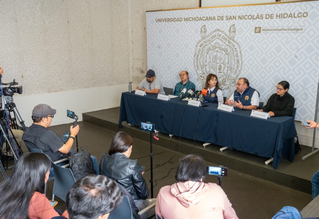 En rueda de prensa, los profesores investigadores nicolaitas, Cuauhtémoc Sáenz Romero y Arnulfo Blanco García, así como la investigadora Verónica Osuna Vallejo, acompañados de la directora del Instituto de Investigaciones sobre los Recursos Naturales (INIRENA), Catalina Rosas Monge y del director de la Facultad de Biología, Ramón López García, compartieron algunos de los resultados que han obtenido entorno al estudio de la mariposa Monarca.