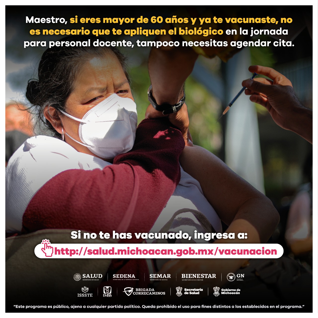 Morelia, Michoacán, a 2 de mayo de 2021.- La Secretaría de Salud de Michoacán (SSM), informó en un comunicado, a los docentes mayores de 60 de años que ya se vacunaron que no es necesario aplicarse nuevamente el biológico contra el COVID-19 durante la jornada de inmunización de las y los maestros en Michoacán, por lo que tampoco es necesario que agenden una cita.