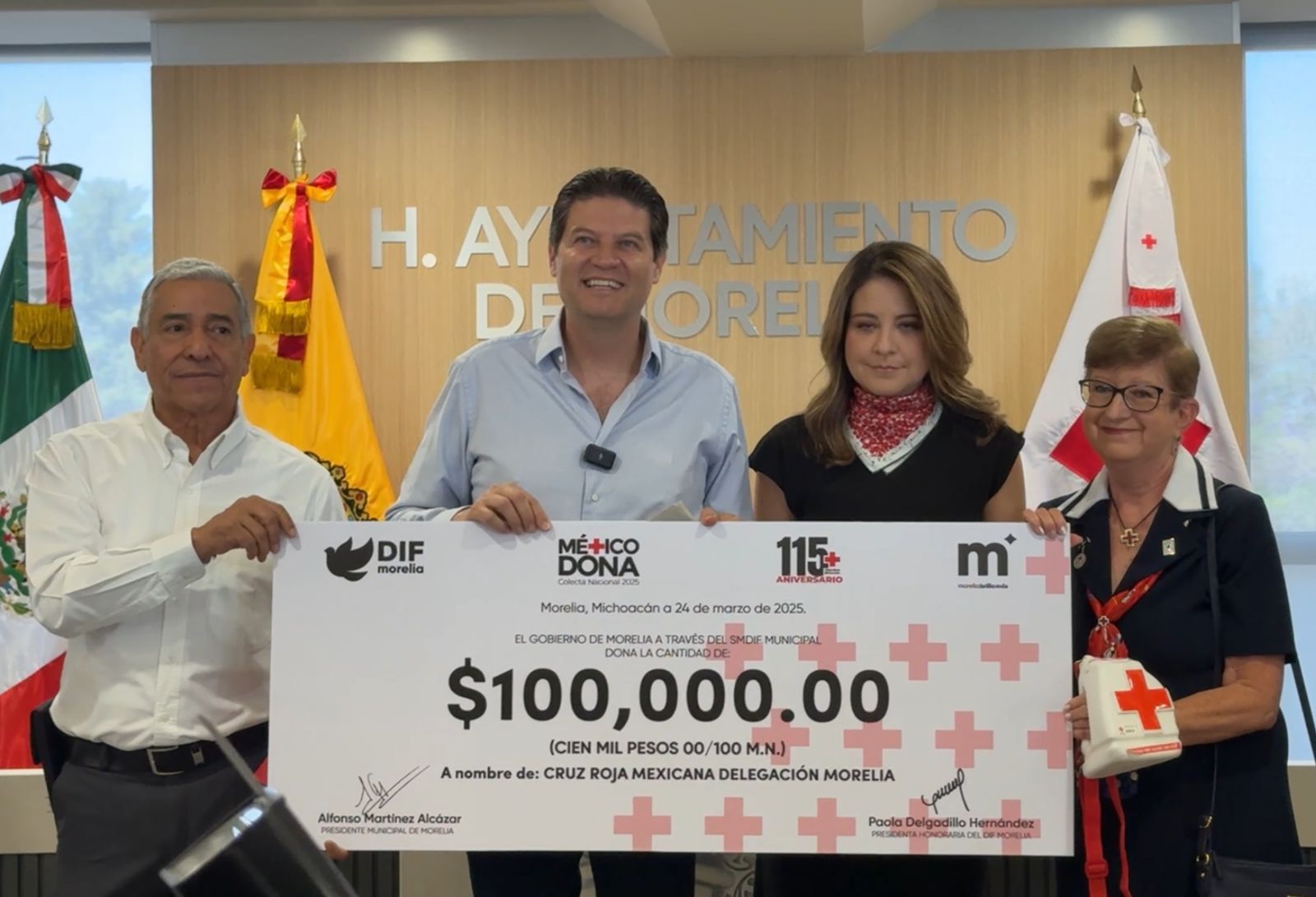 La colecta en Morelia inició con una donación de 100 mil pesos entregada por el propio Alfonso Martínez y por Paola Delgadillo Hernández, presidenta honoraria del DIF municipal.