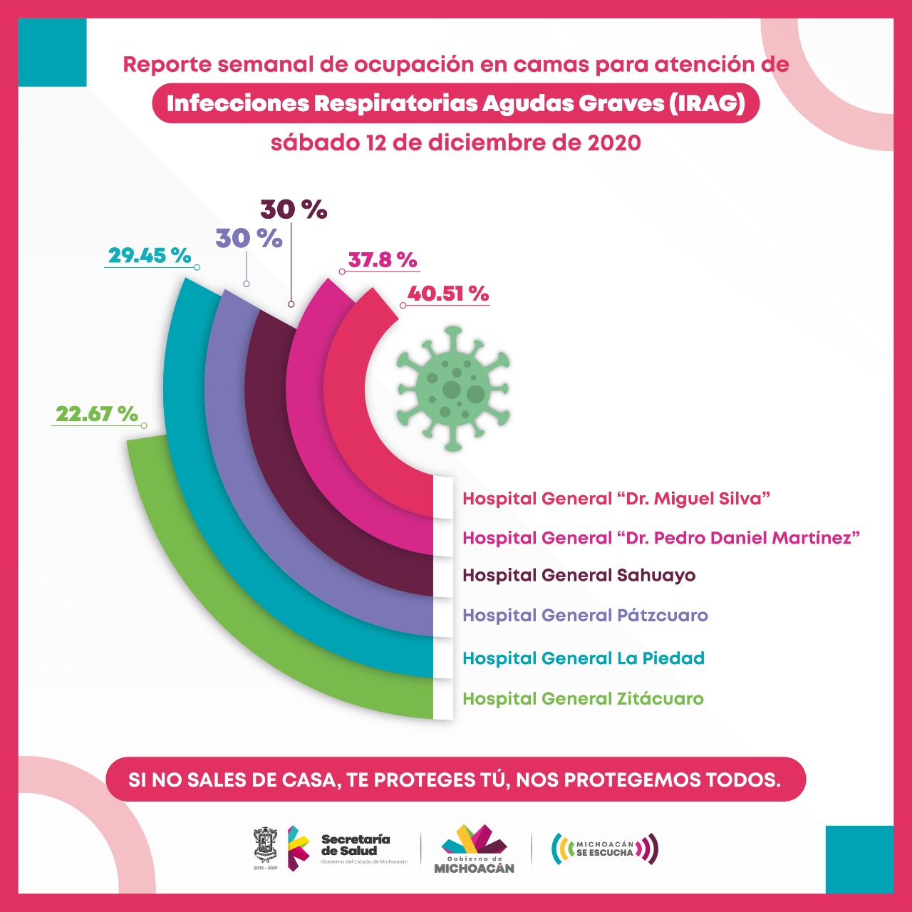 Morelia, Michoacán.- La Secretaría de Salud de Michoacán (SSM), da a conocer las unidades médicas que registran mayor ocupación hospitalaria de camas reconvertidas para la atención de Infecciones Respiratorias Agudas Graves (IRAG).
