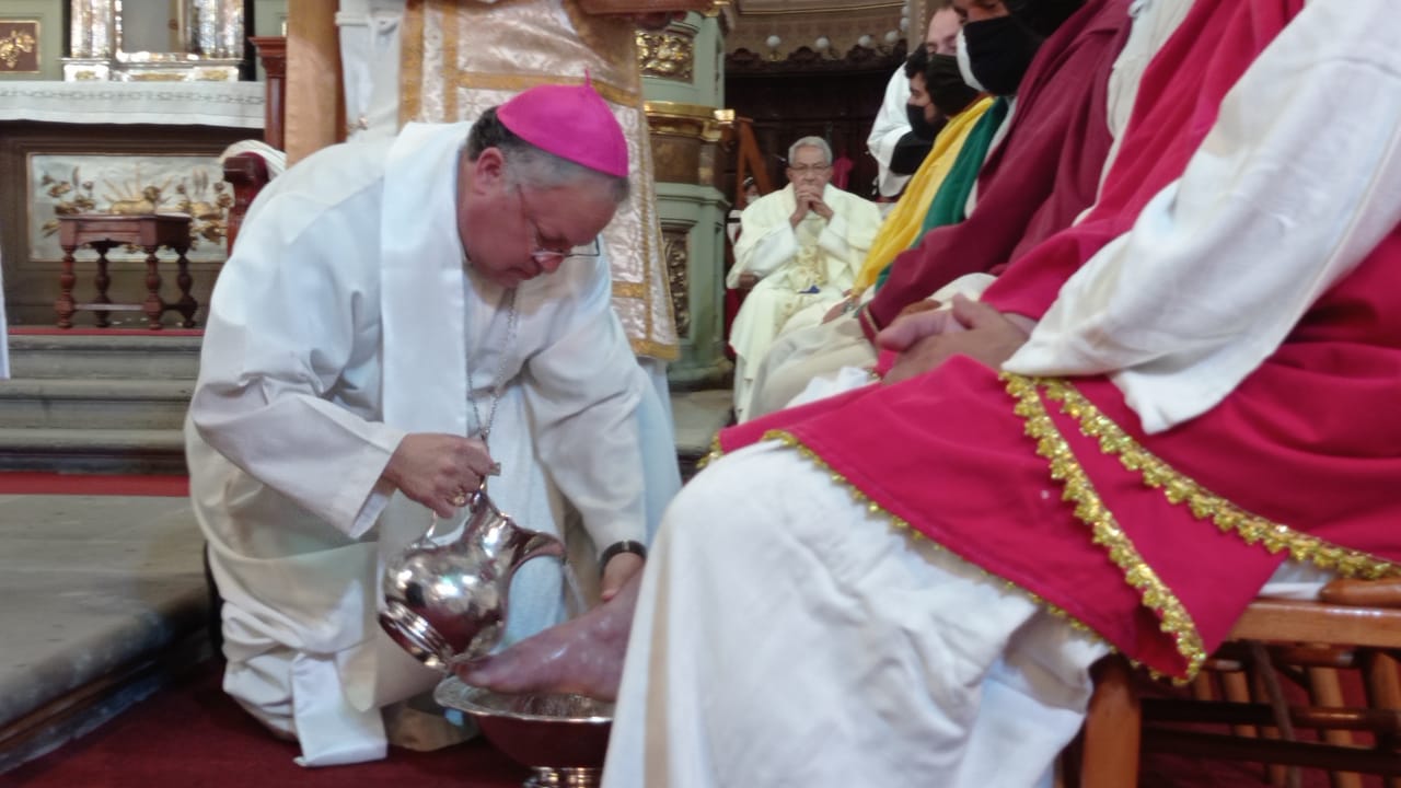 Después de dos años de participación presencial reducida debido a la pandemia del COVID-19, este jueves se realizó la ceremonia de lavatorio de pies, recordando la última cena que Jesús tuvo con sus apóstoles y en la cual demostró humildad y sencillez al lavarle los pies a cada uno de sus discípulos.