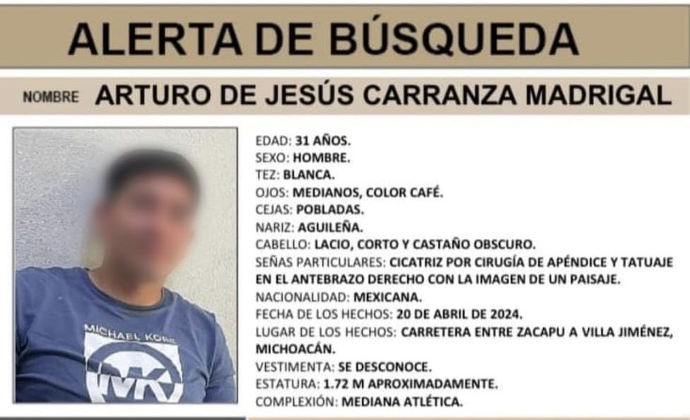 Se trata de Arturo de Jesús C., de 31 años de edad, mismo que fue visto por última vez el pasado sábado 20 de abril, cuando circulaba sobre la carretera Zacapu – Villa Jiménez, las horas transcurrieron sin que sus familiares lograran encontrarlo, por lo que denunciaron su desaparición y se emitió una ficha de búsqueda.