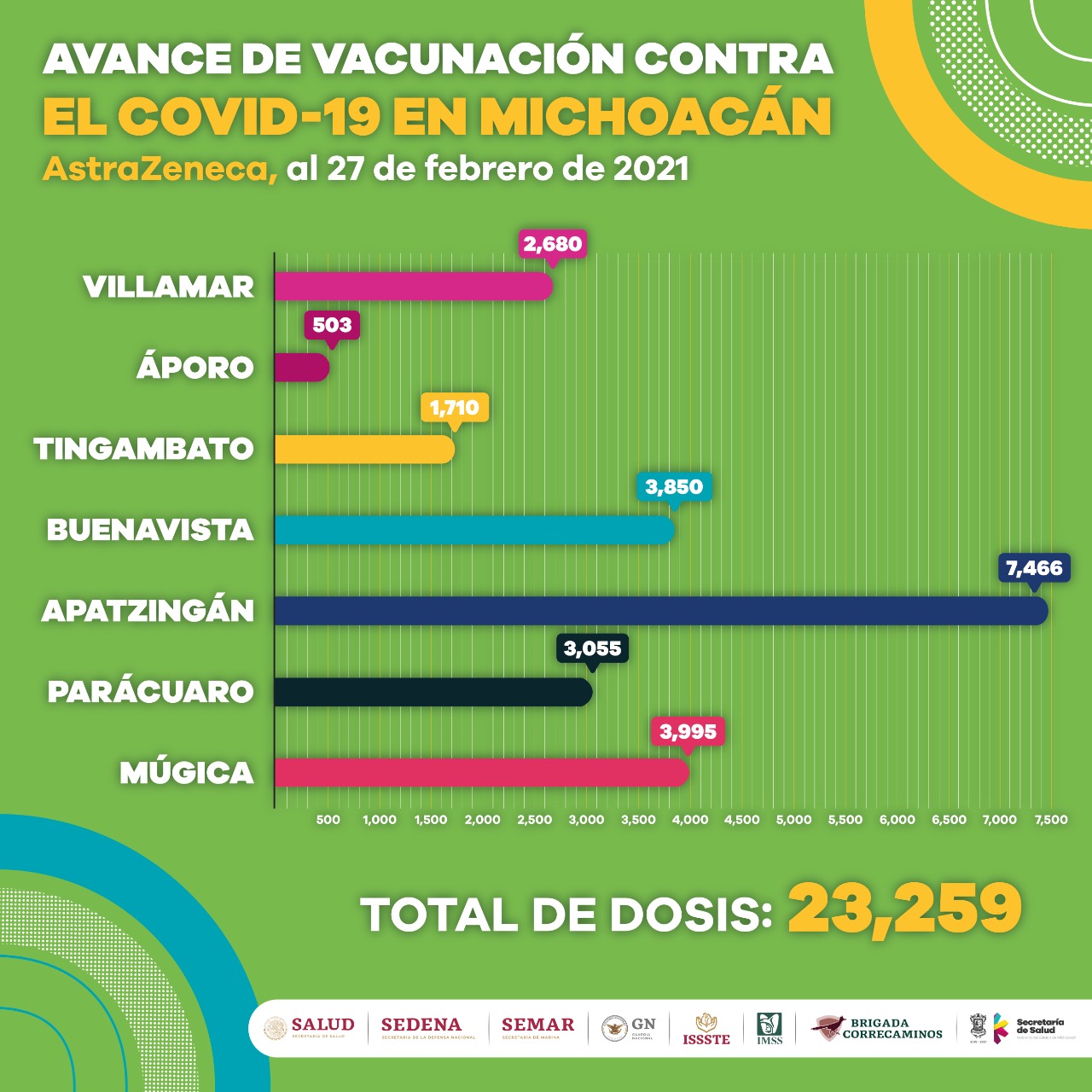 Las jornadas de vacunación se mantienen activas en los municipios de Villamar, Tingambato, Buenavista, Apatzingán, Parácuaro, Múgica, Huetamo y Jacona, mientras que en Áporo el proceso ya concluyó; los próximos municipios donde se llevará a cabo la inmunización son Hidalgo y Lázaro Cárdenas.