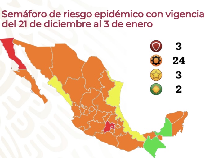Son 24 entidades federativas en el color naranja, tres estados en amarillo y dos que continúan en verde con el riesgo más bajo.