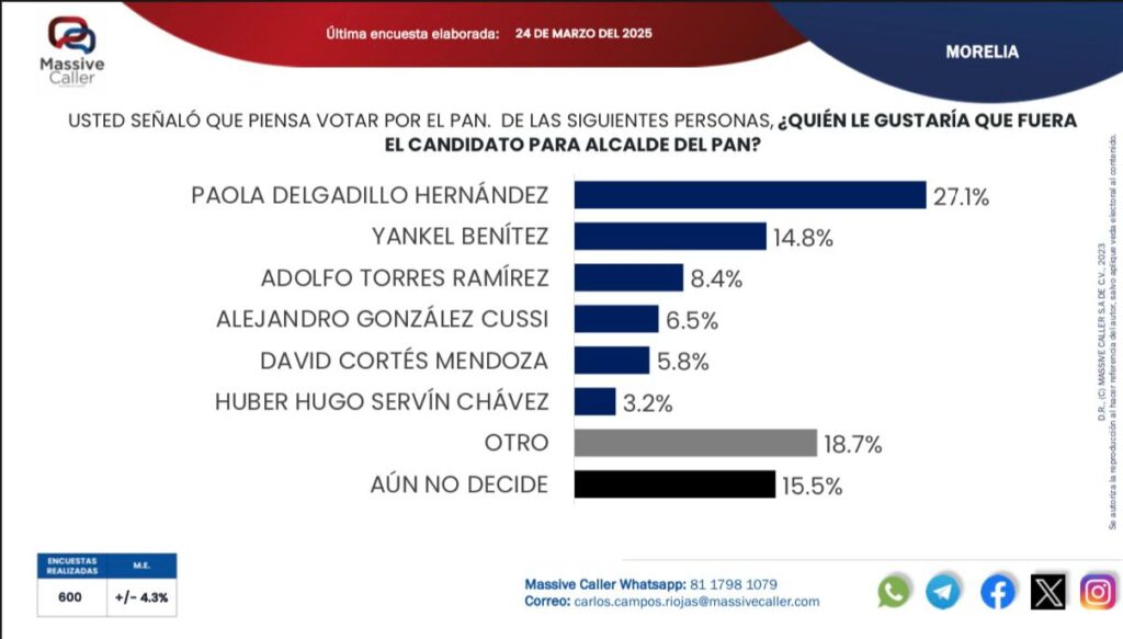 En el caso del PAN, el voto del electorado favorece en primer término a la presidenta del DIF municipal, Paola Delgadillo Hernández con 27.1% de los encuestados; le sigue el secretario del ayuntamiento, Yankel Benítez Silva con 14.8% y luego el director del OOAPAS Morelia, Adolfo Torres Ramírez con 8.4%, casi empatado con el comisionado de Seguridad Alejandro González Cussi con 6.5% y el diputado federal del PAN, David Cortés Mendoza con 5.8%.