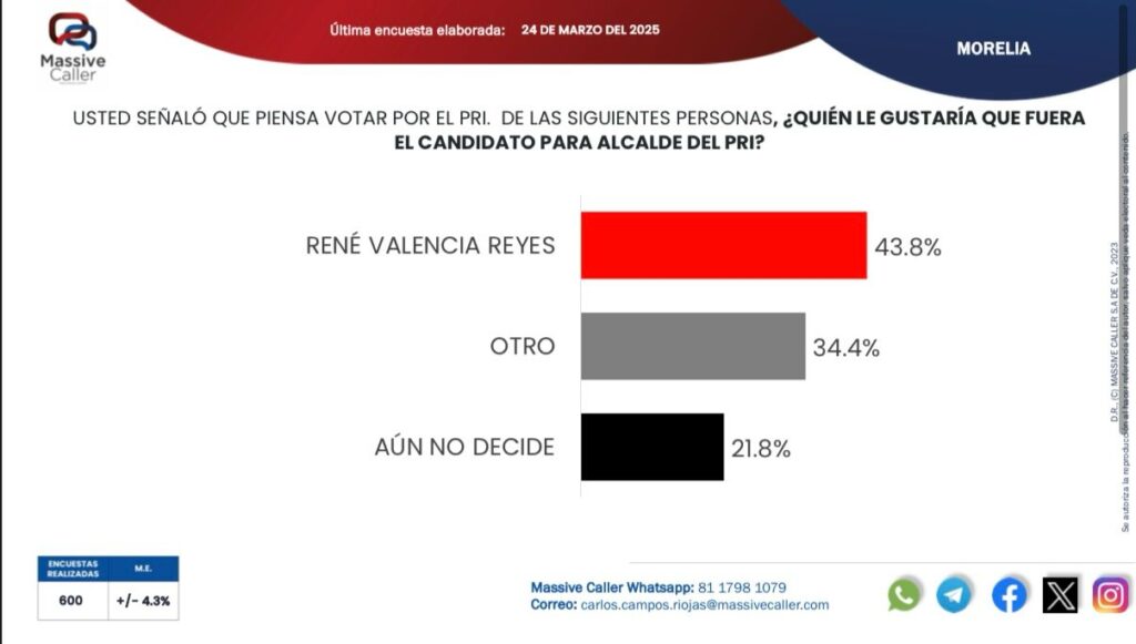 De acuerdo a la encuestadora, al contestar quién le gustaría que fuera el candidato del PRI en 2027, 43.8% contestaron que René Valencia Reyes, quien ya fue postulado como tal en el 2024; de los entrevistados, 34.4% optó por “otro” y 21.8% aún no decide.