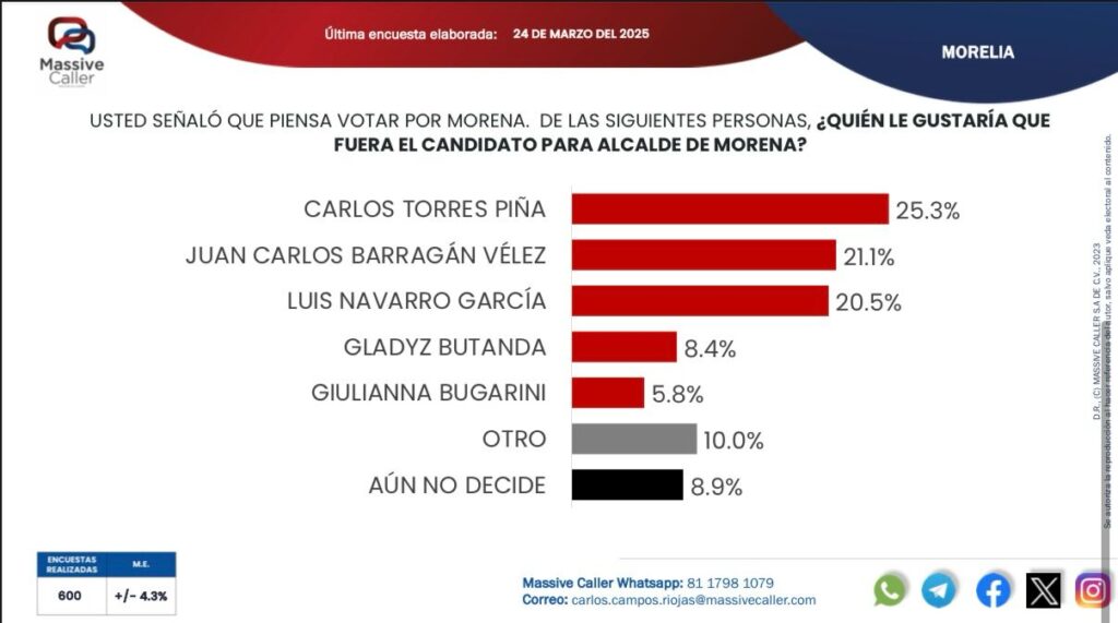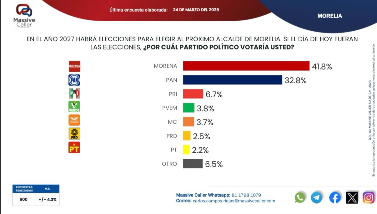 A más de dos años de la elección del 2027, la empresa Massive Caller realizó una encuesta de intención al voto para la alcaldía de Morelia, donde Morena y el Partido Acción Nacional (PAN) tendrían la mayor simpatía electoral entre los ciudadanos.