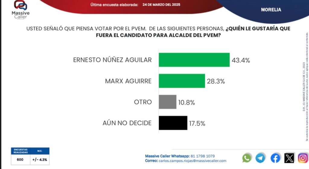 En el Partido Verde Ecologista de México (PVEM), el 43.4% de los entrevistados por Massive Caller señaló que le gustaría que el candidato a la presidencia municipal de la capital michoacana fuera el diputado federal, Ernesto Núñez Aguilar; 28.3% se inclinó por Marx Aguirre; 10.8% dijo que “otro” y 17.5% no ha decidido.