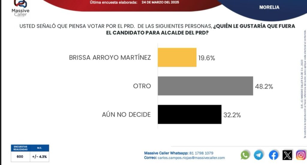 En el caso del PRD, 19.6% señaló que le gustaría que la diputada local Brissa Arroyo Martínez fuera la candidata a la alcaldía de Morelia; 48.2% señaló que “otro”, sin especificar el nombre y 32.2% precisó que aún no decide.