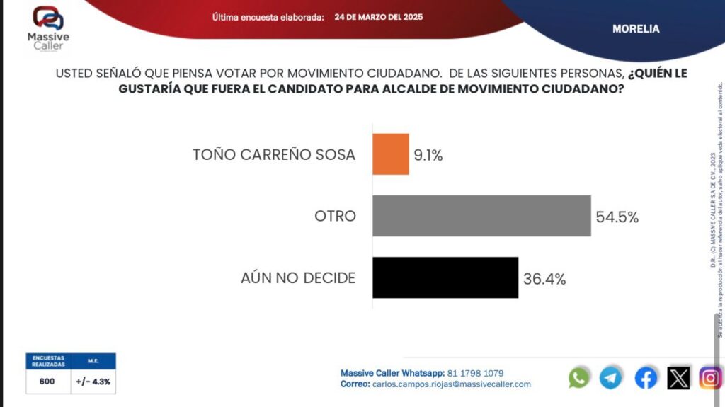 Por Movimiento Ciudadano (MC), sólo 9.1% señaló que le gustaría que el candidato a la alcaldía de Morelia fuera el actual dirigente, Antonio Carreño Sosa, mientras que 54.5% optó por “otro”, aunque no se específica quien; el 36.4% aún no decide.