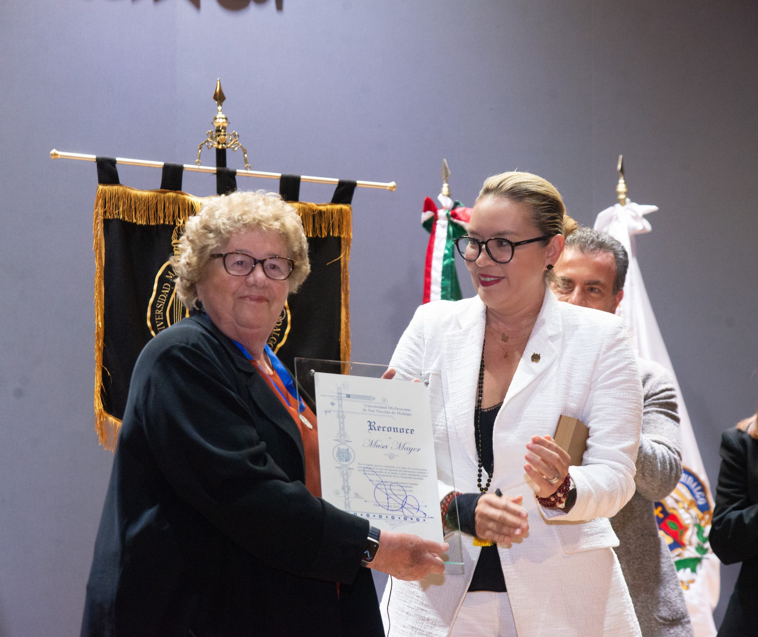 Morelia, Michoacán.- La escritora y activista Musa Mayer, recibió de manos de la rectora de la Universidad Michoacana de San Nicolás de Hidalgo (UMSNH), Yarabí Ávila González, la Condecoración “Raúl Arreola Cortés”, que otorga la institución por primera vez en la historia, para reconocer a personas, asociaciones o instituciones que se distinguen o lo hayan hecho en el campo de las artes y la cultura.