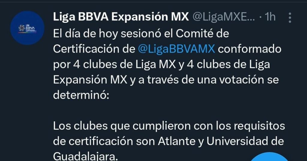 Sin dar mayores detalles, a través de la cuenta de X de la Liga de Expansión MX, se detalló que el comité de certificación de la Liga MX, conformado por 4 clubes de la división de honor y 4 de la categoría de plata sesionó este viernes y determinó que los clubes que cumplieron con los requisitos de certificación fueron Universidad de Guadalajara que recupera este estatus y Atlante que lo mantiene luego de que fue el único club certificado la campaña anterior.