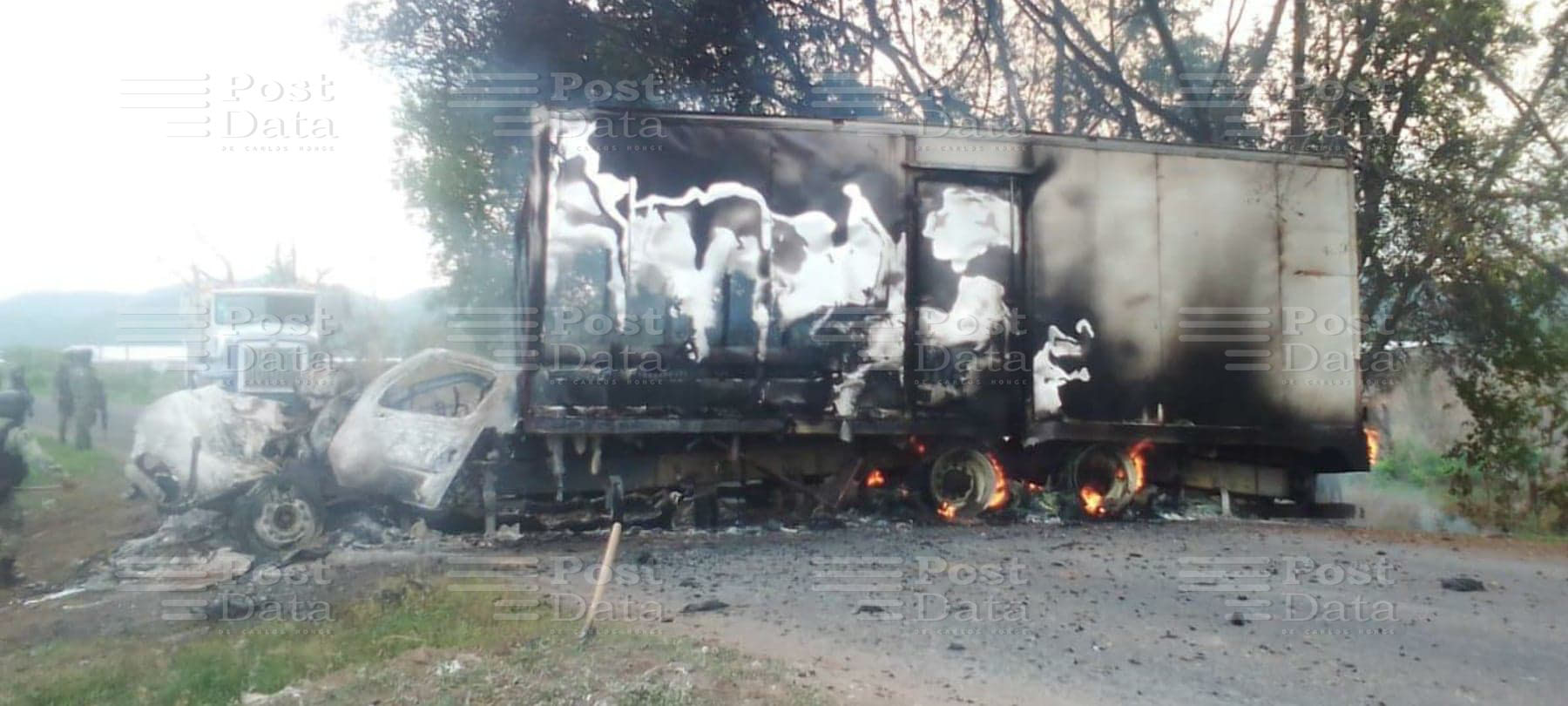 Aguililla, Mich.-Un vehículo de carga fue interceptado por sujetos armados que enseguida lo atravesaron en la carretera Apatzingán-Aguililla y después lo incendiaron. Los criminales se dieron a la fuga y el suceso generó una fuerte movilización policiaca, trascendió en la labor noticiosa.