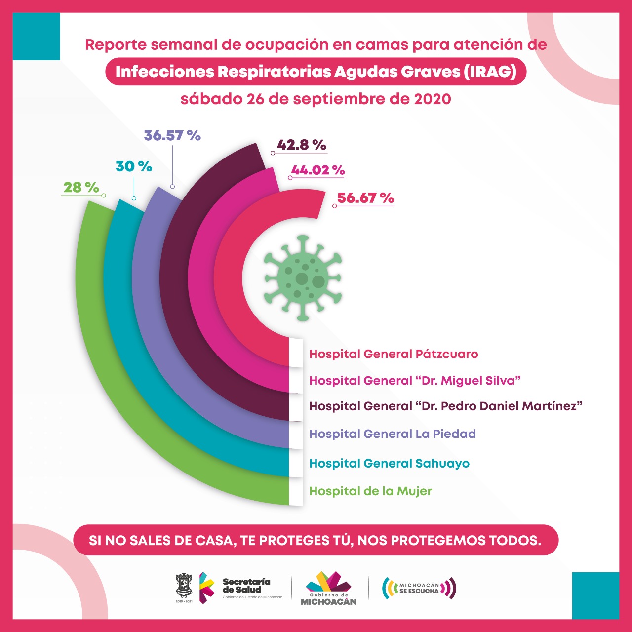 Morelia, Michoacán.- Derivado del comportamiento epidemiológico de COVID-19, las camas reconvertidas para la atención de infecciones Respiratorias Agudas Graves (IRAG), de 6 hospitales de la Secretaría de Salud de Michoacán (SSM), registran una ocupación de entre 28 y 56.67 por ciento.