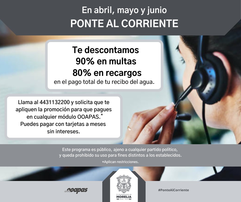 Morelia, Michoacán.-A partir de este miércoles, el Organismo Operador de Agua Potable Alcantarillado y Saneamiento de Morelia (OOAPAS) arrancará un programa de descuentos llamado “Ponte al corriente”, dirigido a los usuarios que presentan rezago en su recibo del agua, para que puedan ponerse al corriente.