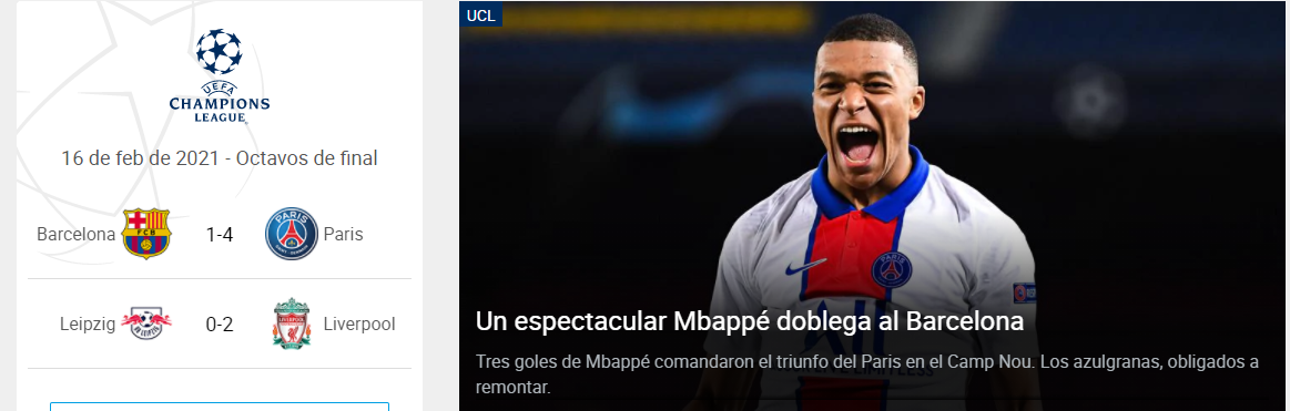 En el Camp Nou el Barcelona recibió la visita del PSG, en un partido lleno de goles, el cual comenzó con gol por parte del equipo local, por medio de Lionel Messi, que anotó de penal al minuto 27, pero la ventaja duró muy poco y al minuto 37 Kylian Mbappé, marcó el 1-1, antes de ir al descanso.