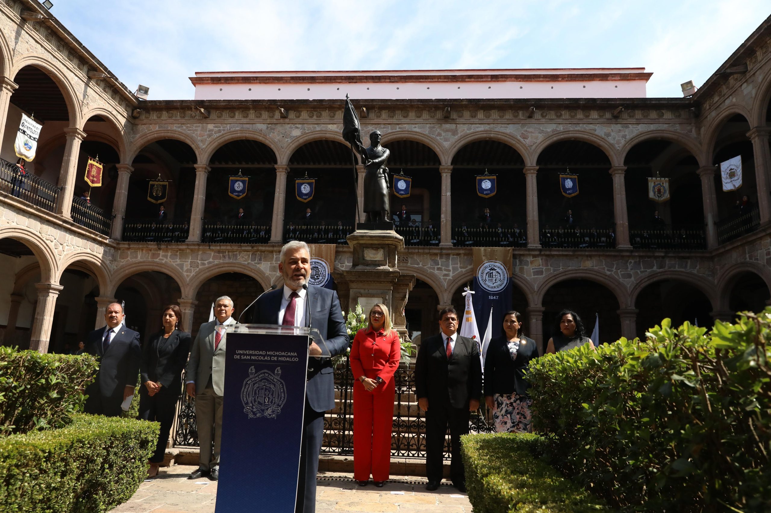 Junto a las autoridades universitarias, diputados y funcionarios, Ramírez Bedolla reconoció a la Casa de Hidalgo, como una institución que forma profesionales y profesionistas con alta responsabilidad social y consciencia crítica.