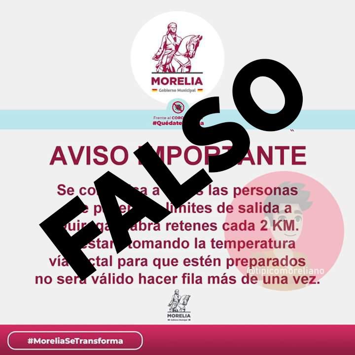 El Gobierno de Morelia, encabezado por el presidente municipal, Raúl Morón Orozco, invitó a la ciudadanía mediante sus redes sociales a no compartir “fake news” que pudieran surgir en el internet, ya que ante la contingencia sanitaria que enfrenta el país, es común la propagación de este tipo de noticias.