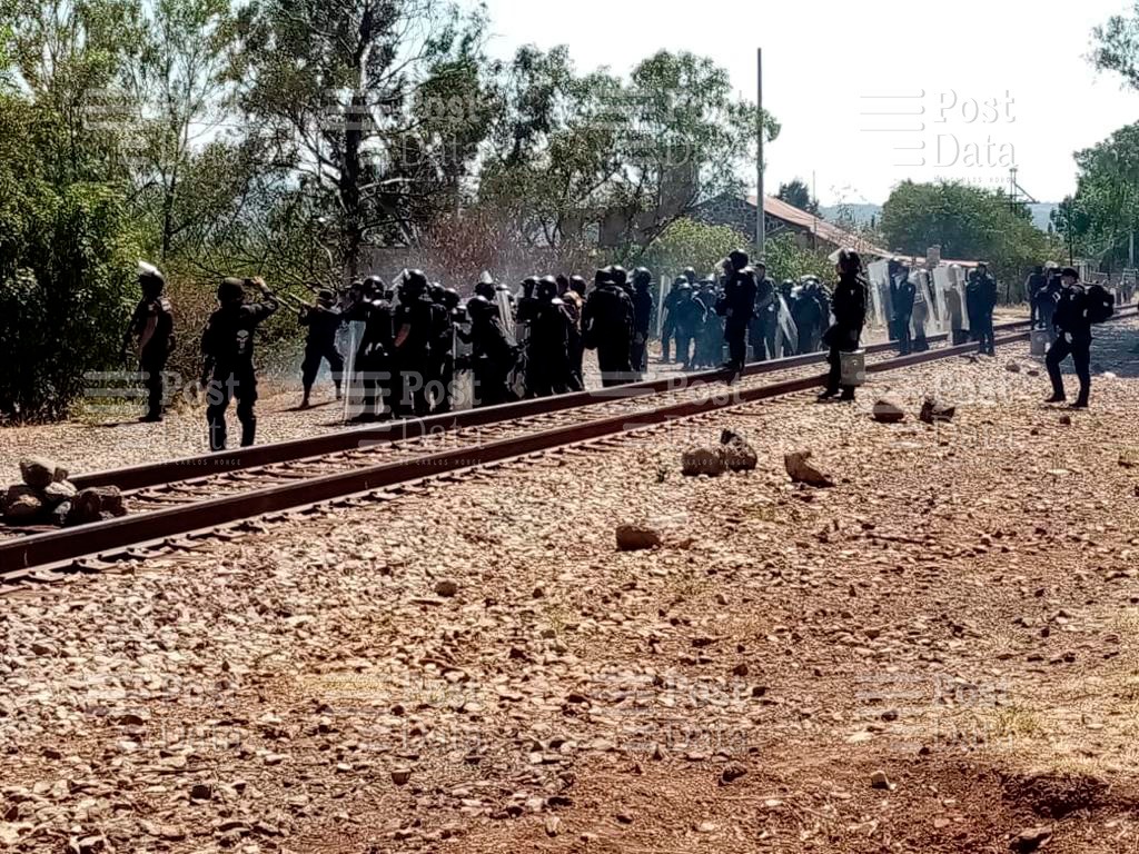 Policías desalojan a estudiantes normalistas que bloqueaban las vías del tren en Tiripetío