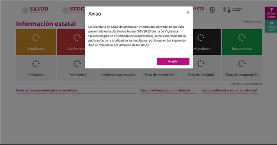 La Secretaría de Salud de Michoacán (SSM), informó que derivado de una falla en la plataforma federal Sistema de Vigilancia Epidemiológica de Enfermedades Respiratorias, (SISVER) se ha visto retrasada la publicación de la totalidad de los resultados de casos positivos de COVID-19 en la entidad.