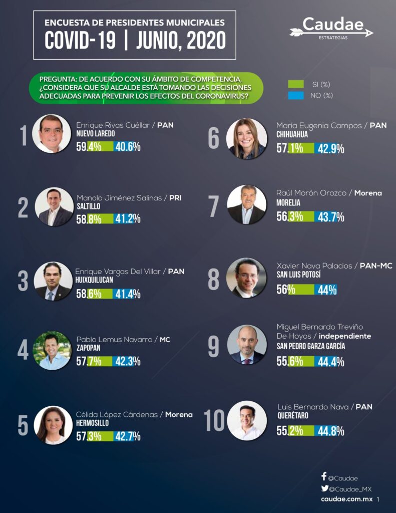 El funcionario de Morena obtuvo el 56.3% de la aprobación y un 43.7% dijo no estar de acuerdo con sus decisiones. En el primer lugar de la encuesta se encuentra Enrique Rivas Cuéllar, edil de Nuevo Laredo por el PAN, con un 59.4% de aprobación; en segunda posición, Manolo Jiménez Salinas, de Saltillo por el PRI, con un 58.8 de aprobación; seguido por Enrique Vargas del Villar, edil panista de Huixquilucan, con un 58.6% a favor.