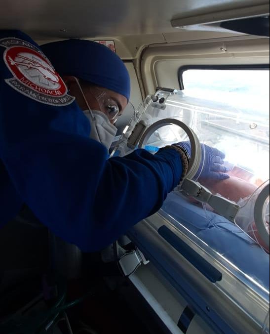 Derivado de una urgencia obstétrica, el prematuro tuvo que ser trasladado de urgencias a la capital michoacana, por lo que paramédicos del CRUM en coordinación con la Dirección de Servicios Aéreos del Gobierno del Estado, realizaron el traslado aéreo.