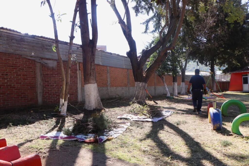 Además, en el marco de estas acciones, el equipo de Parques y Jardines realizó la poda de árboles en el Jardín de Niños “Justo Sierra”, con el propósito de garantizar la seguridad de las y los pequeños que disfrutan del área de juegos.