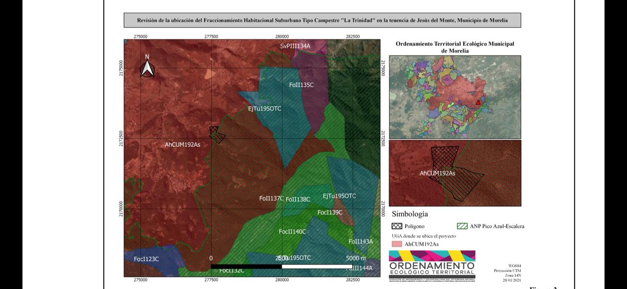 Del Sistema Estatal de Área para la Conservación del Patrimonio Natural, SEACPN, se identifica que parte del polígono presentado se encuentra ubicado dentro de la Zona de Protección Ambiental “Pico Azul-La Escalera” y en el Programa de Desarrollo Urbano de Centro de Población de Morelia 2010 indica que la zonificación o usos de suelo establecidos en el área del proyecto son: Protección Especial, PE, Protección Ecológica Forestal, PEF, Protección Agropecuaria, PAP, Restauración y Protección Ambiental, RPA, y que de acuerdo con la tabla de compatibilidad de uso de suelo se considera incompatible la vivienda rural y suburbana que se pretende desarrollar, por lo que se determina que el proyecto pretendido no es congruente con los instrumentos.
