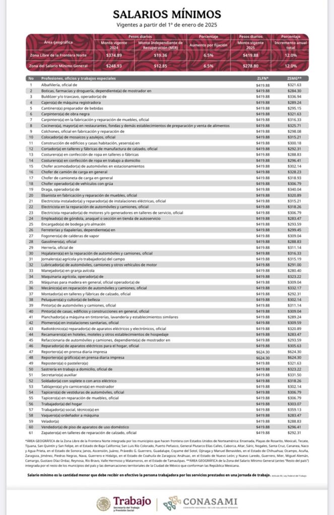 La Comisión de Salarios Mínimos determinó que a partir de este 1 de enero del 2025, el salario mínimo general incrementa 12%, de tal manera que aumentará de 248.93 a 278.80 pesos diarios, mientras en la Zona Libre de la Frontera Norte (ZLFN) pasará de 374.89 a 419.88 pesos diarios.