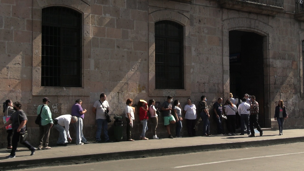 Este miércoles de quincena se presentaron largas filas de clientes afuera de los bancos en espera de realizar algún trámite desde temprana hora. Esta situación mostró la prioridad que los morelianos adjudican a las medidas de prevención por el COVID-19.