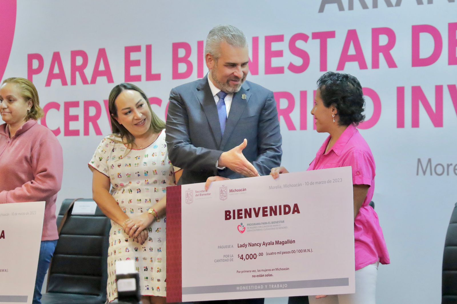 En apoyo a 1 mil 374 mujeres con cáncer de mamá y cervicouterino invasor, cuidadoras de menores, este viernes el gobierno de Michoacán puso en marcha el programa por el que se les otorgará una pensión mensual de 4 mil pesos, con los que se pretende permanezcan en sus tratamientos oncológicos durante 3 años y salven su vida.