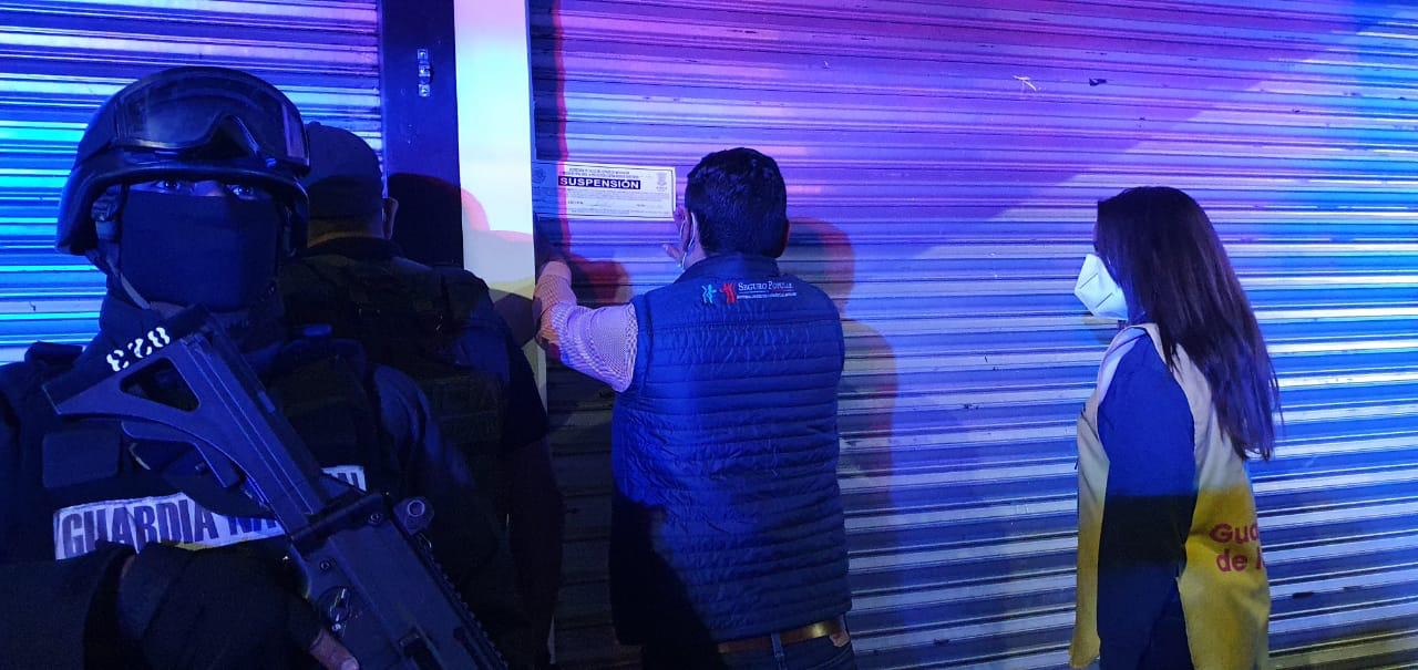 Dentro de los establecimientos que fueron suspendidos por la autoridad sanitaria, se encuentran dos tiendas de Abarrotes Azteca, una vinatería y un local de anuncios luminosos, por estar abiertos después de la hora permitida (19:00 horas).