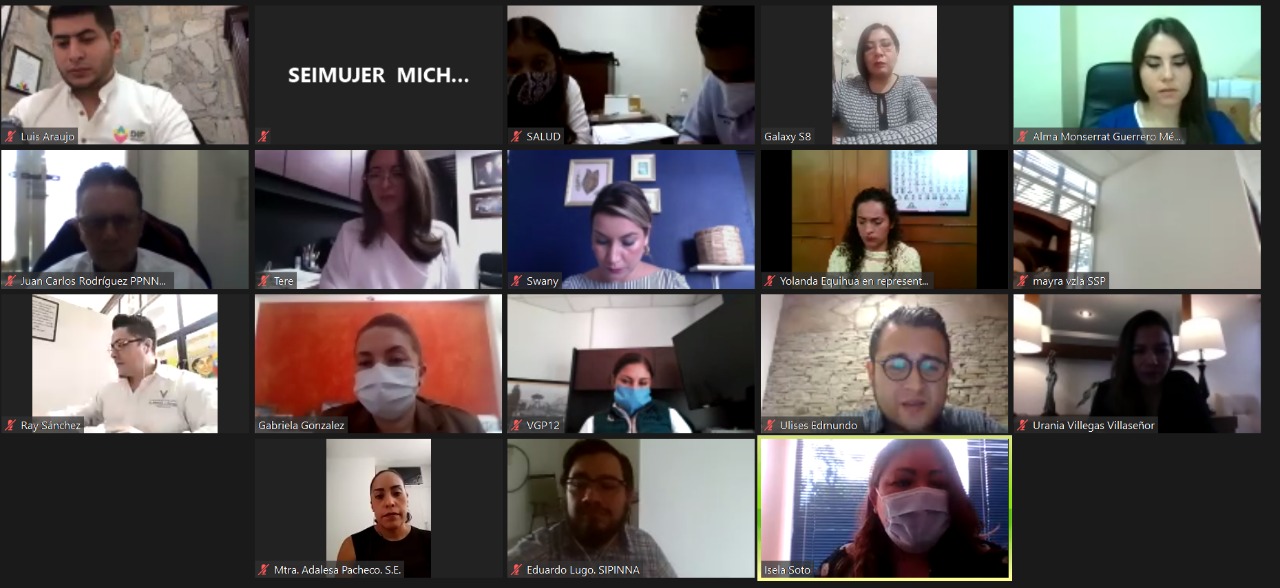 Durante la reunión virtual estuvieron presentes la encargada del despacho de la Secretaría de Desarrollo Social y Humano, Teresa Madrigal Alaniz; la directora del Registro Civil de Morelia, Teresa Ruiz Valencia; la fiscal de Investigación y Persecución del Homicidio Doloso contra la Mujer y Feminicidio, Verónica Guzmán Pérez; la secretaria ejecutiva del Sistema Estatal de Protección Integral de Niñas, Niños y Adolescentes de Michoacán, Yolanda Equihua Equihua.