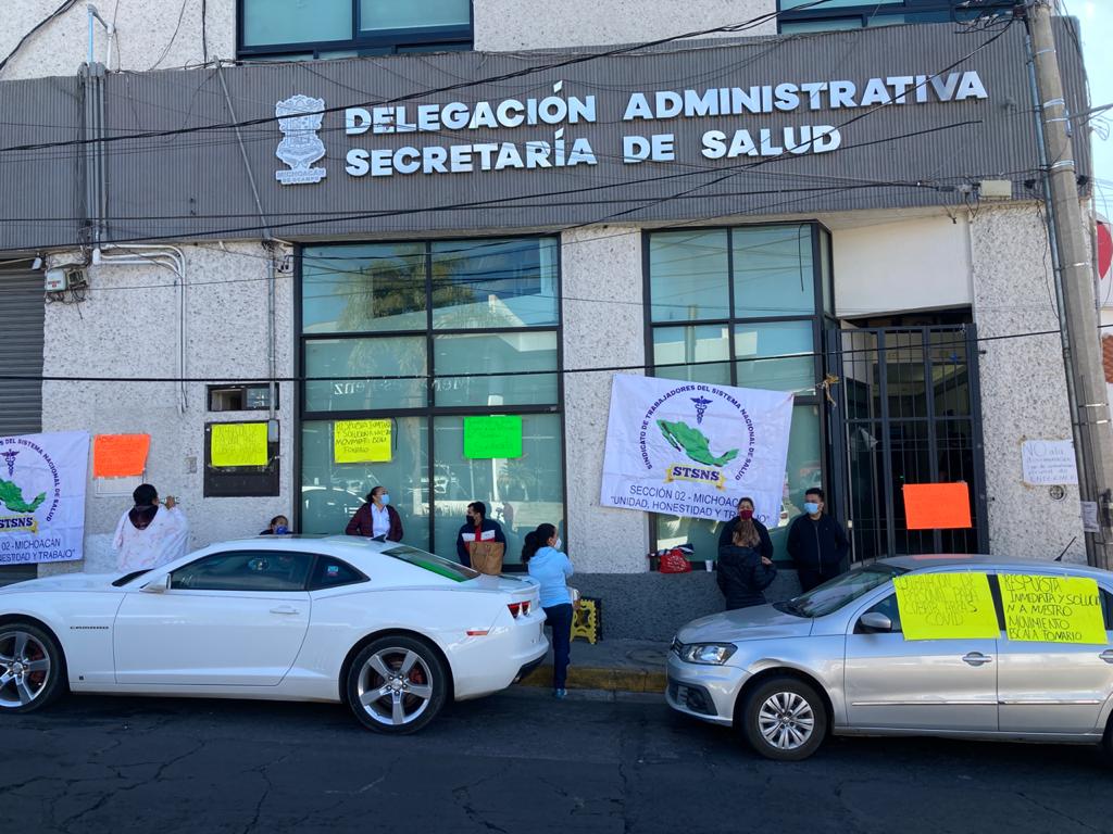 Trabajadores del sector salud se manifestaron en la delegación administrativa de la Secretaría de Salud de Michoacán (SSM) en demanda de que se respeten los derechos laborales y humanos de quienes se encuentran en condiciones vulnerables para atender en la primera línea al Covid-19.