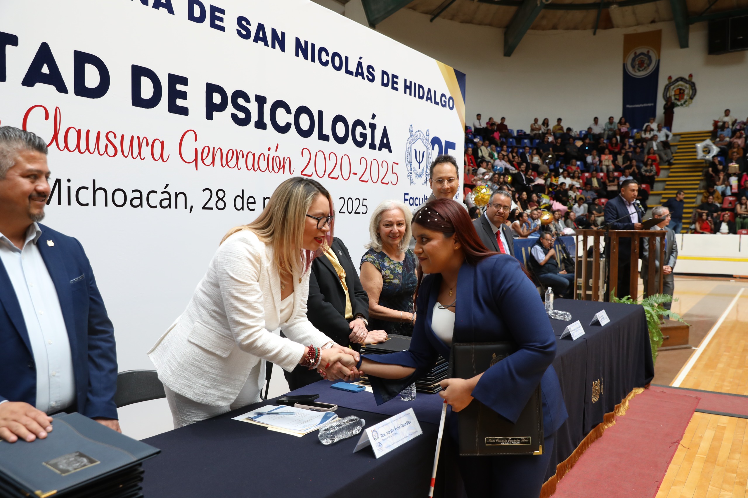 Morelia, Michoacán.- “Trabajemos por una sociedad más justa, una sociedad donde la igualdad sea nuestra sombra”, manifestó la rectora de la Universidad Michoacana de San Nicolás de Hidalgo (UMSNH), Yarabí Ávila González, al hacer entrega de cartas de pasante a agregadas y egresados de la Facultad de Psicología.