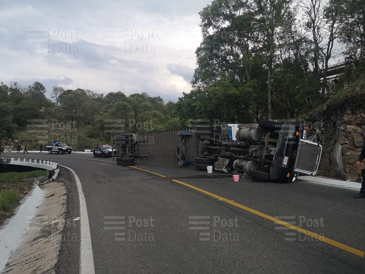 Maravatío, Mich.– Un tractocamión volcó en la Autopista de Occidente y afortunadamente no hubo víctimas que lamentar. La situación generó la rápida movilización del personal de la Dirección General de Seguridad en Carreteras e instalaciones de la Guardia Nacional (GN), así como de unos paramédicos locales que atendieron la emergencia.