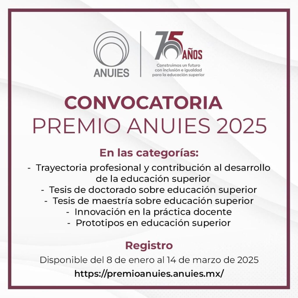 El registro de candidatas y candidatos ya se encuentra abierto y estará disponible hasta el próximo 14 de marzo a través del sitio web https://premioanuies.anuies.mx/, mismo donde se pueden consultar las bases para cada una de las categorías.