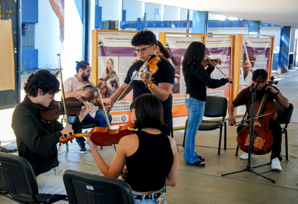 De igual forma, se realizó la exposición de carteles titulada “Mujeres que inspiran”, acompañada con una presentación musical a cargo de alumnas y alumnos de la Facultad Popular de Bellas Artes (FPBA).