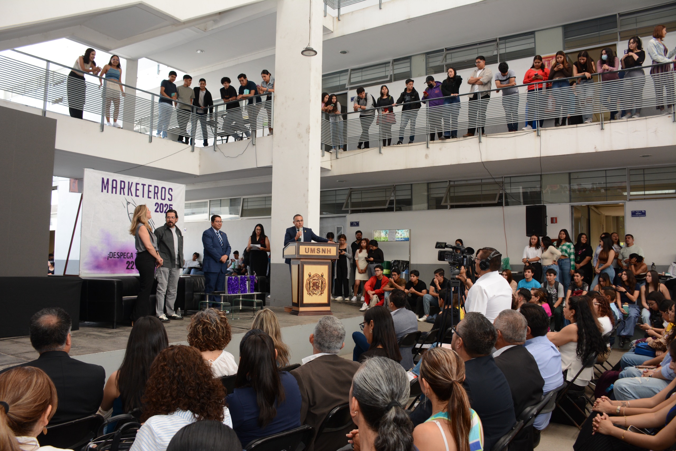 Morelia, Michoacán.- Tras la reciente acreditación de la Licenciatura en Mercadotecnia por un periodo de cinco años y con la representación de la rectora de la Universidad Michoacana de San Nicolás de Hidalgo (UMSNH), Yarabí Ávila González, el tesorero de la casa de estudios, Enrique Eduardo Román García, inauguró el evento denominado Merketeros 2025, un espacio para fortalecer la formación del alumnado.