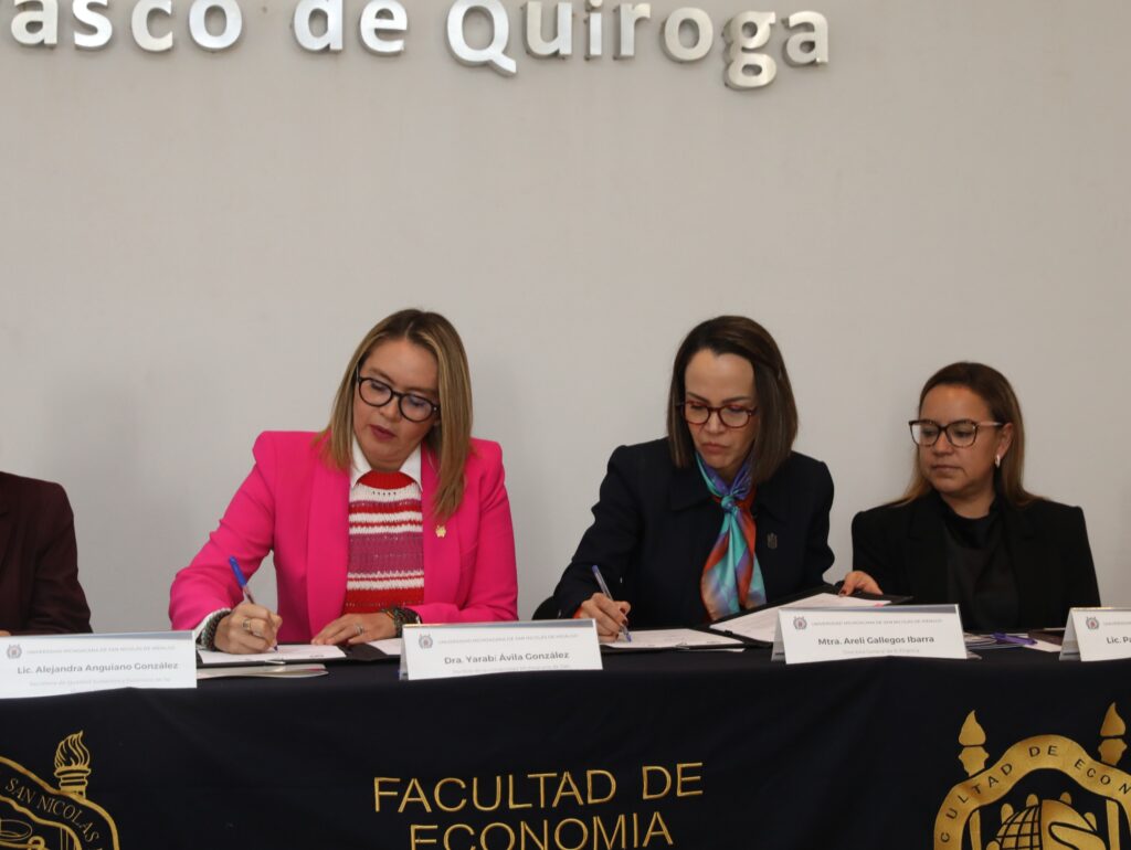 Morelia, Michoacán.- Impulsar el desarrollo económico de las mujeres nicolaitas es uno de los objetivos del convenio signado por la rectora de la Universidad Michoacana de San Nicolás de Hidalgo (UMSNH), Yarabí Ávila González y la directora general del Sistema Integral de Financiamiento para el Desarrollo de Michoacán (Sí Financia), Areli Gallegos Ibarra.