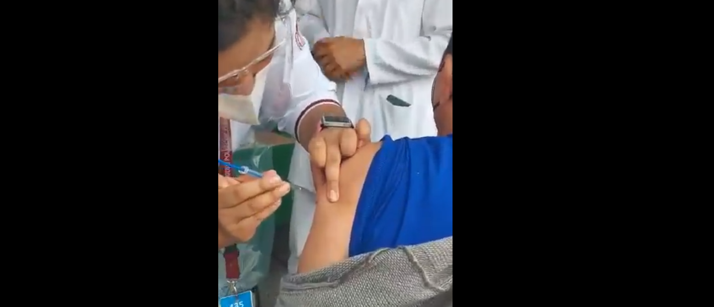 “El caso de la jeringa, nos ha informado, que hay dos versiones. Una que entró el señor molesto, que no es extraño, mucha gente mayor va a regañadientes. Dicen que el señor iba así, molesto, y que llamó mucho la atención que iba un familiar con una cámara, la enfermera dice que cuando lo inyectó ella estaba nerviosa porque estaba la cámara y que, en efecto sacó la aguja y no le puso la vacuna. Entonces fueron dos piquetes, uno sin líquido, metió la aguja y la sacó. Y la otra donde se la aplicó y después nota nacional”