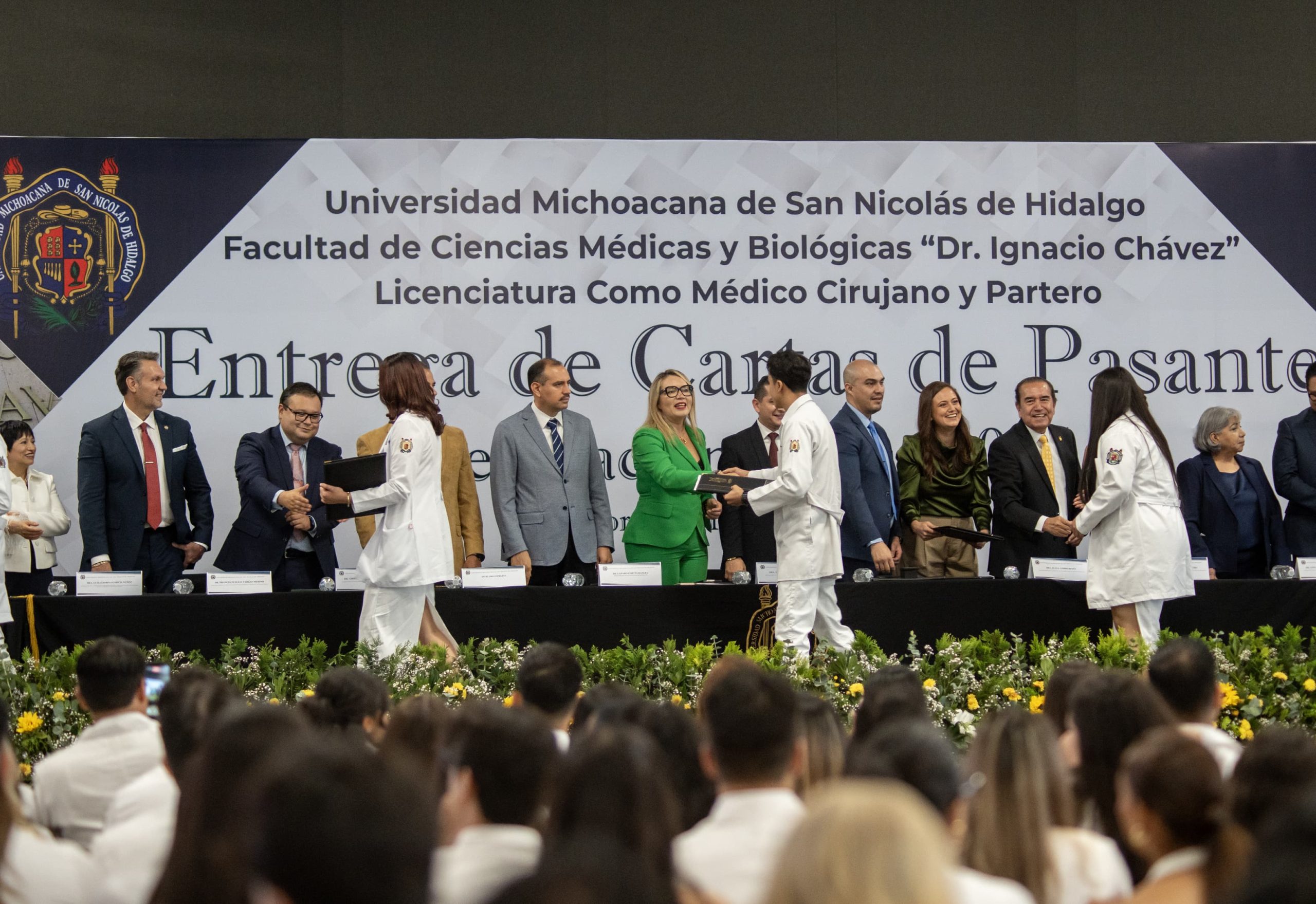 Morelia, Michoacán.-“Hoy, están aquí y lo lograron con el alma llena de orgullo, y quiero felicitar de todo corazón a todos ustedes, porque son testimonio vivo de que los sueños se alcanzan”, afirmó la rectora de la Universidad Michoacana de San Nicolás de Hidalgo (UMSNH), Yarabí Ávila González, al hacer entrega de cartas de pasante a integrantes de la generación 2020-2025 de la Licenciatura como Médico Cirujano, dependiente de la Facultad de Ciencias Médicas y Biológicas.
