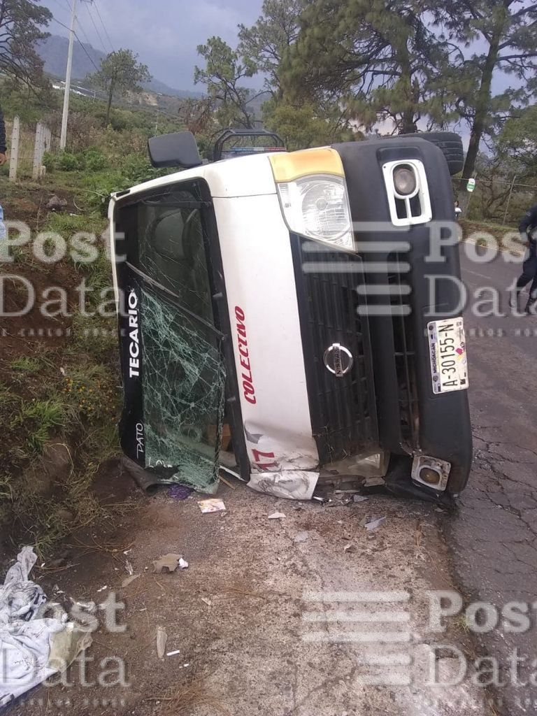 Tacámbaro, Mich.- Una combi del transporte público protagonizó un aparatoso accidente en carretera Tacámbaro- Tecario, dejando como saldo un lesionado leve, según se supo en la cobertura noticiosa.