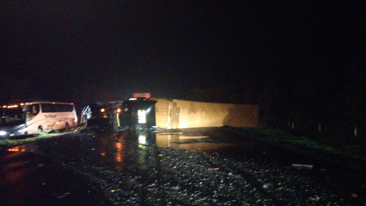 El accidente tuvo lugar a la altura del kilómetro 160+000, donde un tráiler con cabina negra, con remolque de color naranja y razón social “3T”, terminó recostado sobre su lado izquierdo, bloqueando ambos carriles.